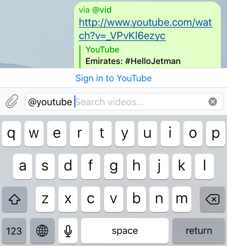 Some inline bots can benefit from an initial setup process, like connecting them to an account on an external service (e.g., YouTube). We've added an easy way of switching between the private chat with a bot and whatever chat the user wants to share inline results in.