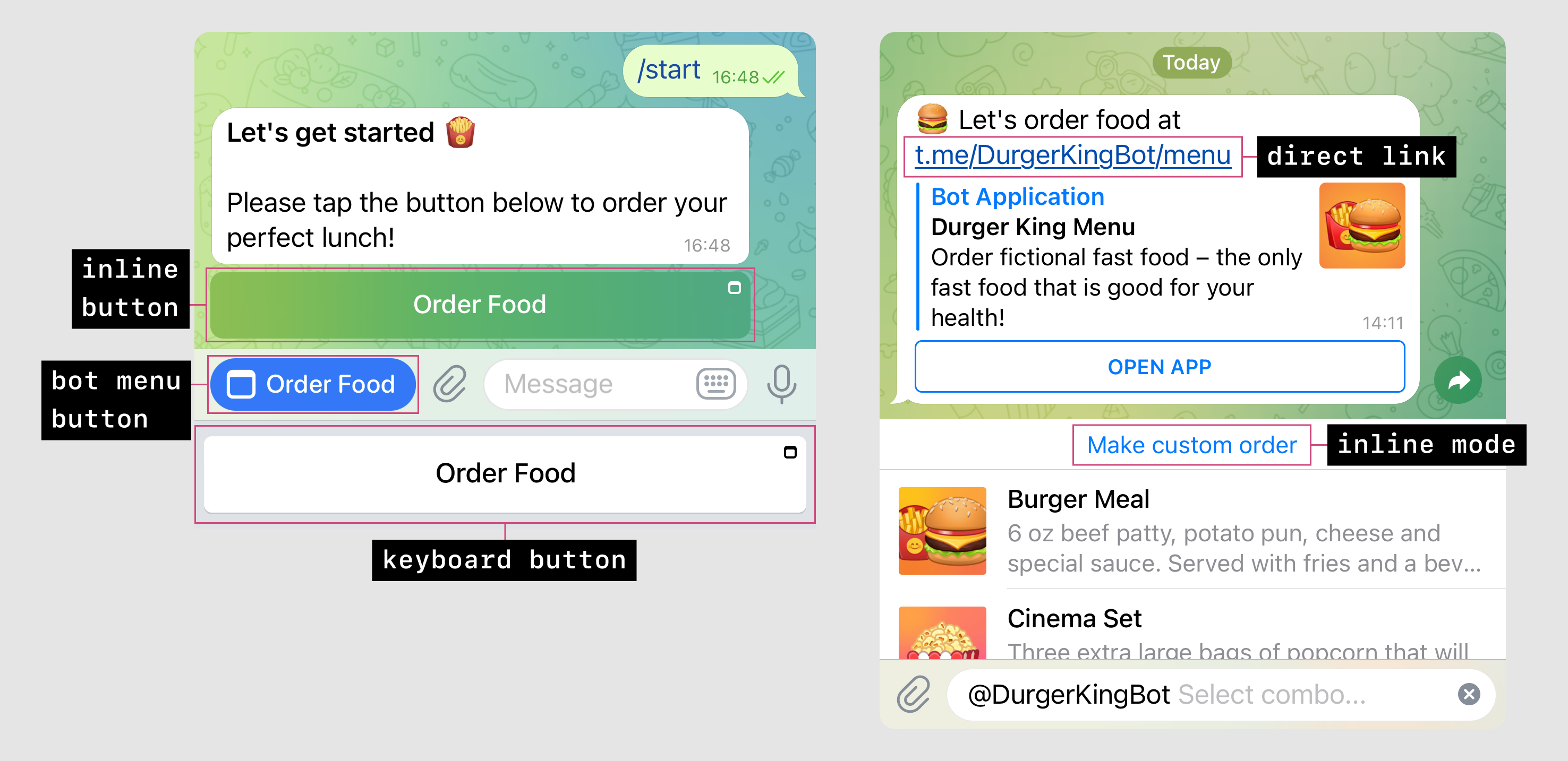 @DurgerKingBot allows launching its Mini App both from an inline button and from the menu button.