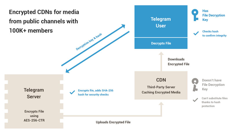 CDNs are very limited when it comes to communication: the master data center only uploads encrypted files for storage and will accept no data from the CDN. The client apps only download encrypted files and accept no other updates. The client apps obtain the keys necessary to decrypt the file from the main Telegram server and verify the integrity of the file by its hash, which means that the CDN may only supply the correct file – anything different will be immediately discarded by the client.